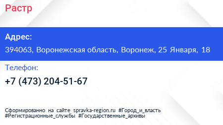 Растр по адресу 394063, Воронежская область, Воронеж, 25 Января, 18 в дальнейшем Организация, размещена в следующих категориях: