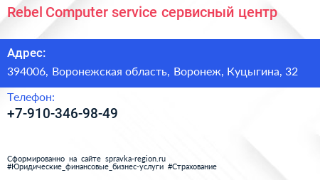 Rebel Computer service, сервисный центр по адресу 394006, Воронежская область, Воронеж, Куцыгина, 32 в дальнейшем Организация, размещена в следующих категориях:
