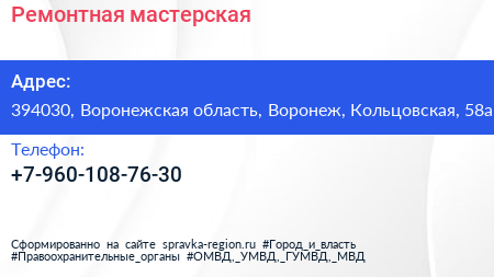 Ремонтная мастерская по адресу 394030, Воронежская область, Воронеж, Кольцовская, 58а в дальнейшем Организация, размещена в следующих категориях: