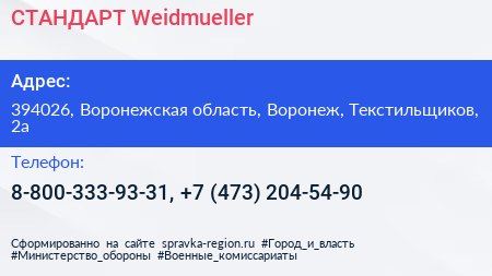 СТАНДАРТ-Weidmueller по адресу 394026, Воронежская область, Воронеж, Текстильщиков, 2а в дальнейшем Организация, размещена в следующих категориях: