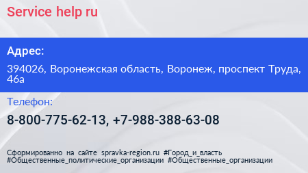 Service-help.ru по адресу 394026, Воронежская область, Воронеж, проспект Труда, 46а в дальнейшем Организация, размещена в следующих категориях: