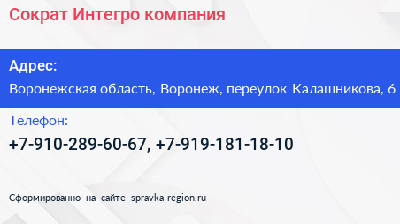 Сократ-Интегро, компания по адресу Воронежская область, Воронеж, переулок Калашникова, 6 в дальнейшем Организация, размещена в следующих категориях: