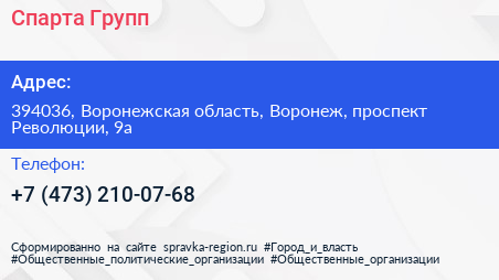 Спарта Групп по адресу 394036, Воронежская область, Воронеж, проспект Революции, 9а в дальнейшем Организация, размещена в следующих категориях: