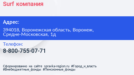 Surf, компания по адресу 394018, Воронежская область, Воронеж, Средне-Московская, 1д в дальнейшем Организация, размещена в следующих категориях: