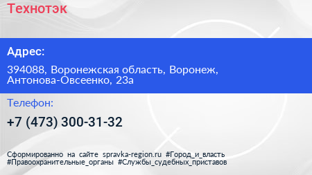Технотэк по адресу 394088, Воронежская область, Воронеж, Антонова-Овсеенко, 23а в дальнейшем Организация, размещена в следующих категориях: