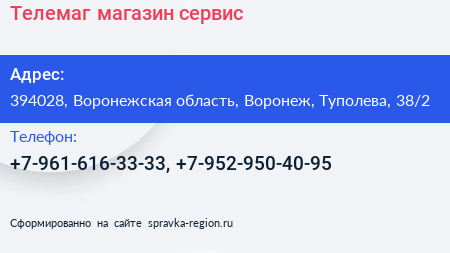 Телемаг, магазин-сервис по адресу 394028, Воронежская область, Воронеж, Туполева, 38/2 в дальнейшем Организация, размещена в следующих категориях: