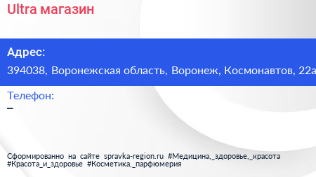Ultra, магазин по адресу 394038, Воронежская область, Воронеж, Космонавтов, 22а в дальнейшем Организация, размещена в следующих категориях: