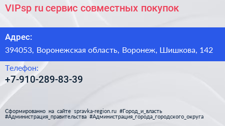 VIPsp.ru, сервис совместных покупок по адресу 394053, Воронежская область, Воронеж, Шишкова, 142 в дальнейшем Организация, размещена в следующих категориях:
