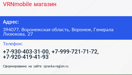 VRNmobile, магазин по адресу 394077, Воронежская область, Воронеж, Генерала Лизюкова, 27 в дальнейшем Организация, размещена в следующих категориях: