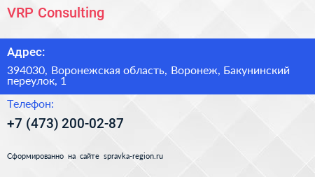 VRP Consulting по адресу 394030, Воронежская область, Воронеж, Бакунинский переулок, 1 в дальнейшем Организация, размещена в следующих категориях: