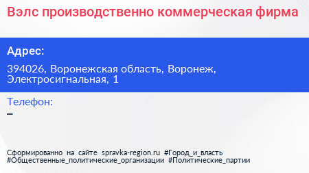 Вэлс, производственно-коммерческая фирма по адресу 394026, Воронежская область, Воронеж, Электросигнальная, 1 в дальнейшем Организация, размещена в следующих категориях: