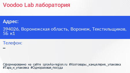 Voodoo Lab, лаборатория по адресу 394026, Воронежская область, Воронеж, Текстильщиков, 5Б к1 в дальнейшем Организация, размещена в следующих категориях: