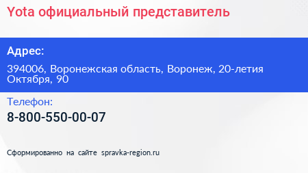 Yota, официальный представитель по адресу 394006, Воронежская область, Воронеж, 20-летия Октября, 90 в дальнейшем Организация, размещена в следующих категориях: