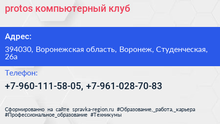 protos, компьютерный клуб по адресу 394030, Воронежская область, Воронеж, Студенческая, 26а в дальнейшем Организация, размещена в следующих категориях: