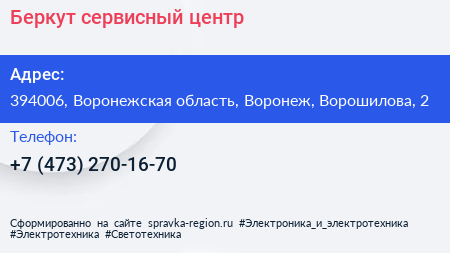 Беркут, сервисный центр по адресу 394006, Воронежская область, Воронеж, Ворошилова, 2 в дальнейшем Организация, размещена в следующих категориях: