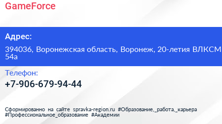 GameForce по адресу 394036, Воронежская область, Воронеж, 20-летия ВЛКСМ, 54а в дальнейшем Организация, размещена в следующих категориях: