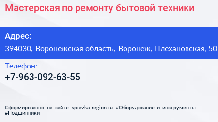 Мастерская по ремонту бытовой техники по адресу 394030, Воронежская область, Воронеж, Плехановская, 50 в дальнейшем Организация, размещена в следующих категориях: