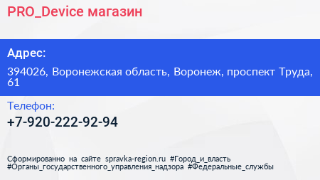 PRO_Device, магазин по адресу 394026, Воронежская область, Воронеж, проспект Труда, 61 в дальнейшем Организация, размещена в следующих категориях: