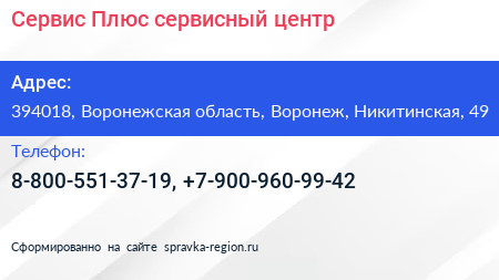Сервис Плюс, сервисный центр по адресу 394018, Воронежская область, Воронеж, Никитинская, 49 в дальнейшем Организация, размещена в следующих категориях:
