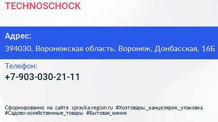 TECHNOSCHOCK по адресу 394030, Воронежская область, Воронеж, Донбасская, 16Б в дальнейшем Организация, размещена в следующих категориях: