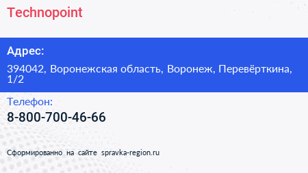 Technopoint по адресу 394042, Воронежская область, Воронеж, Перевёрткина, 1/2 в дальнейшем Организация, размещена в следующих категориях:
