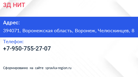 3Д НИТ по адресу 394071, Воронежская область, Воронеж, Челюскинцев, 8 в дальнейшем Организация, размещена в следующих категориях: