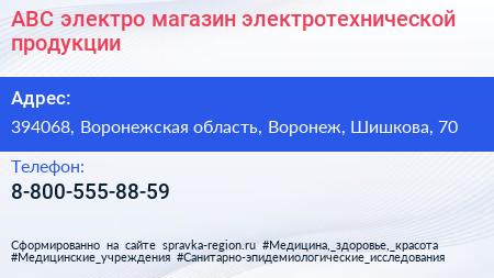 АВС электро, магазин электротехнической продукции по адресу 394068, Воронежская область, Воронеж, Шишкова, 70 в дальнейшем Организация, размещена в следующих категориях: