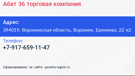 Абат 36, торговая компания по адресу 394019, Воронежская область, Воронеж, Еремеева, 22 к2 в дальнейшем Организация, размещена в следующих категориях:
