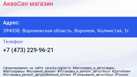 АкваСан, магазин по адресу 394038, Воронежская область, Воронеж, Холмистая, 1г в дальнейшем Организация, размещена в следующих категориях: