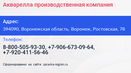 Акварелла, производственная компания по адресу 394090, Воронежская область, Воронеж, Ростовская, 78 в дальнейшем Организация, размещена в следующих категориях: