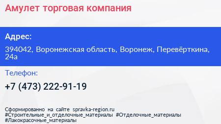 Амулет, торговая компания по адресу 394042, Воронежская область, Воронеж, Перевёрткина, 24а в дальнейшем Организация, размещена в следующих категориях: