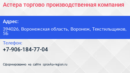 Астера, торгово-производственная компания по адресу 394026, Воронежская область, Воронеж, Текстильщиков, 5Б в дальнейшем Организация, размещена в следующих категориях: