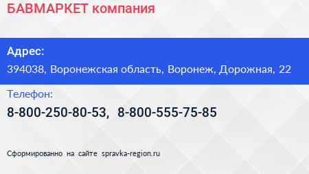БАВМАРКЕТ, компания по адресу 394038, Воронежская область, Воронеж, Дорожная, 22 в дальнейшем Организация, размещена в следующих категориях: