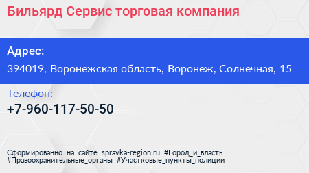 Бильярд-Сервис, торговая компания по адресу 394019, Воронежская область, Воронеж, Солнечная, 15 в дальнейшем Организация, размещена в следующих категориях: