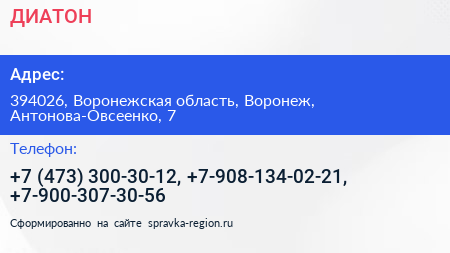 ДИАТОН по адресу 394026, Воронежская область, Воронеж, Антонова-Овсеенко, 7 в дальнейшем Организация, размещена в следующих категориях: