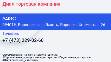 Диал, торговая компания по адресу 394019, Воронежская область, Воронеж, Холмистая, 26 в дальнейшем Организация, размещена в следующих категориях: