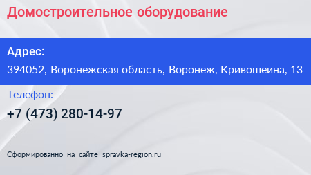 Домостроительное оборудование по адресу 394052, Воронежская область, Воронеж, Кривошеина, 13 в дальнейшем Организация, размещена в следующих категориях: