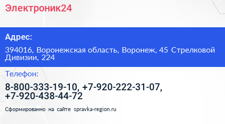 Электроник24 по адресу 394016, Воронежская область, Воронеж, 45 Стрелковой Дивизии, 224 в дальнейшем Организация, размещена в следующих категориях: