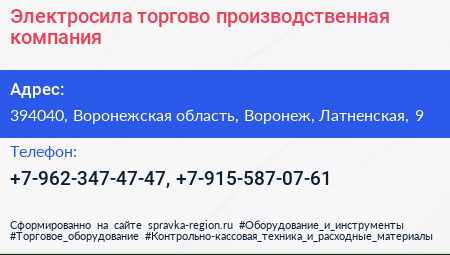 Электросила, торгово-производственная компания по адресу 394040, Воронежская область, Воронеж, Латненская, 9 в дальнейшем Организация, размещена в следующих категориях:
