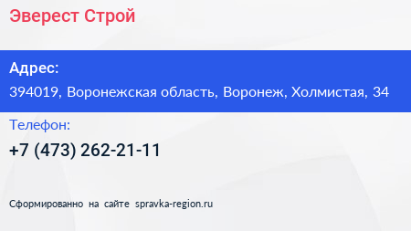 Эверест-Строй по адресу 394019, Воронежская область, Воронеж, Холмистая, 34 в дальнейшем Организация, размещена в следующих категориях: