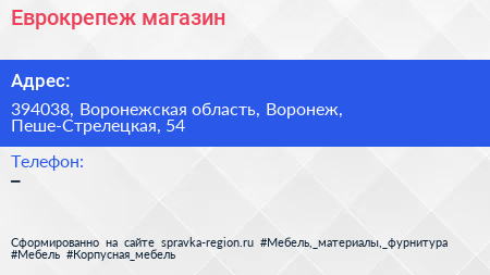 Еврокрепеж, магазин по адресу 394038, Воронежская область, Воронеж, Пеше-Стрелецкая, 54 в дальнейшем Организация, размещена в следующих категориях: