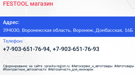 FESTOOL, магазин по адресу 394030, Воронежская область, Воронеж, Донбасская, 16Б в дальнейшем Организация, размещена в следующих категориях: