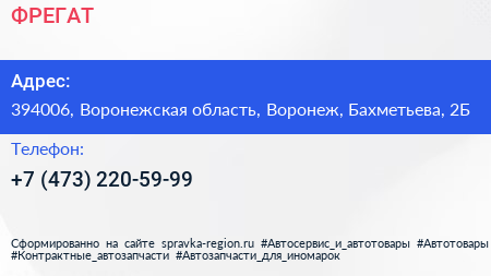 ФРЕГАТ по адресу 394006, Воронежская область, Воронеж, Бахметьева, 2Б в дальнейшем Организация, размещена в следующих категориях: