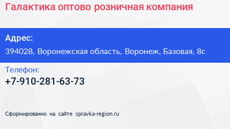 Галактика, оптово-розничная компания по адресу 394028, Воронежская область, Воронеж, Базовая, 8с в дальнейшем Организация, размещена в следующих категориях: