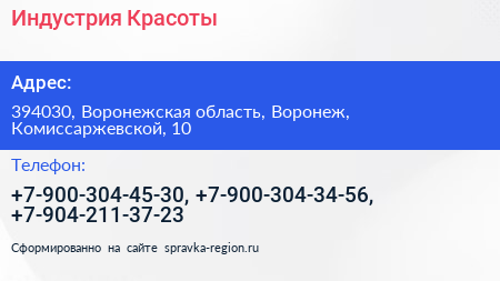 Индустрия Красоты по адресу 394030, Воронежская область, Воронеж, Комиссаржевской, 10 в дальнейшем Организация, размещена в следующих категориях: