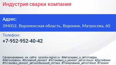 Индустрия сварки, компания по адресу 394052, Воронежская область, Воронеж, Матросова, 60 в дальнейшем Организация, размещена в следующих категориях: