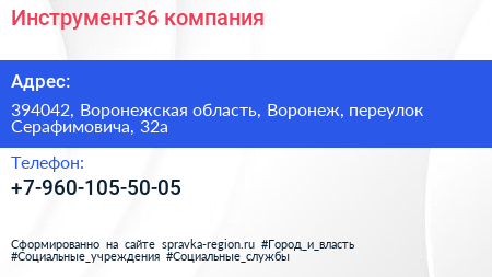 Инструмент36, компания по адресу 394042, Воронежская область, Воронеж, переулок Серафимовича, 32а в дальнейшем Организация, размещена в следующих категориях: