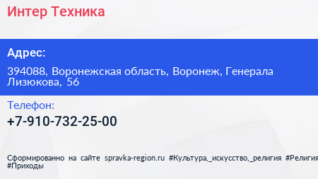 Интер Техника по адресу 394088, Воронежская область, Воронеж, Генерала Лизюкова, 56 в дальнейшем Организация, размещена в следующих категориях: