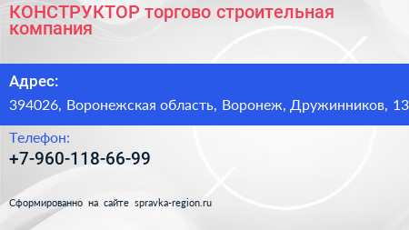 КОНСТРУКТОР, торгово-строительная компания по адресу 394026, Воронежская область, Воронеж, Дружинников, 13 в дальнейшем Организация, размещена в следующих категориях: