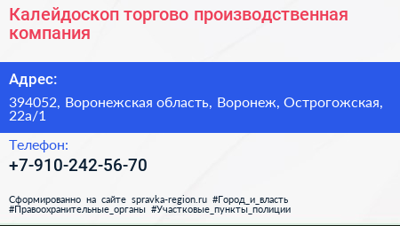 Калейдоскоп, торгово-производственная компания по адресу 394052, Воронежская область, Воронеж, Острогожская, 22а/1 в дальнейшем Организация, размещена в следующих категориях: